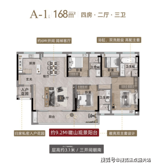 2. 布局设计:采用横厅设计,客厅面宽约7.5米,进深约4.8米,空间开阔,采光通风极佳,客厅与餐厅相连,形成超大活动空间,可满足家庭聚会、儿童玩耍等需求;厨房采用L型设计,操作动线合理,配备国际品牌厨具,同时预留冰箱位置,实用性强;主卧朝南,带独立卫生间与衣帽间,私密性强,主卧面宽约3.9米,进深约5.8米,配备全景飘窗,视野开阔,可欣赏南向山景;三个次卧中,两个朝南、一个朝北,面宽分别约3.3米、3.1米、2.9米,进深均约4.2米,空间宽敞,可作为儿童房、书房、客房,灵活使用;公共卫生间采用干湿分离设计,配备淋浴、马桶、洗手台等,使用便捷。
