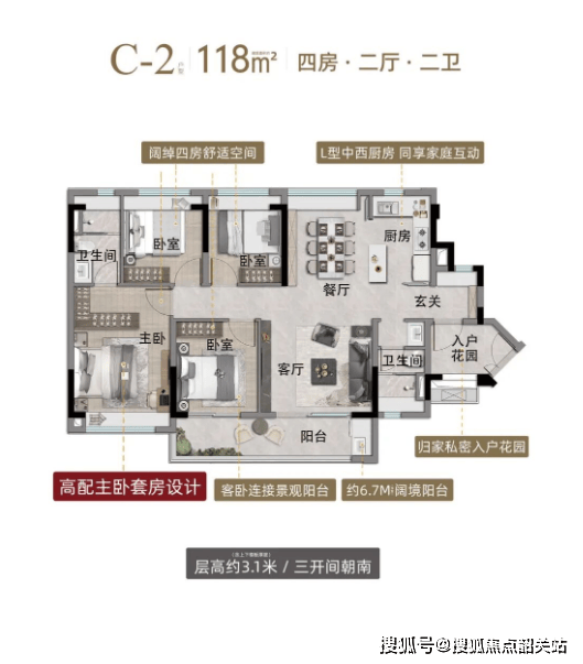 2. 布局设计:采用LDK一体化设计,客厅与餐厅、厨房相连,形成超大活动空间,客厅面宽约8.8米,进深约5.5米,空间宽敞,可满足高端接待、家庭聚会等需求;厨房采用L型设计,操作动线合理,配备国际品牌高端厨具,品质感强;主卧朝南,带独立卫生间、衣帽间及飘窗,私密性强,主卧面宽约4.0米,进深约6.2米,空间奢华,居住舒适度高;三个次卧中,两个朝南、一个朝北,其中一间朝南次卧带独立卫生间,可作为老人房或客房,三个次卧面宽分别约3.4米、3.2米、3.0米,进深均约4.4米,空间宽敞;公共卫生间采用干湿分离设计,使用便捷。