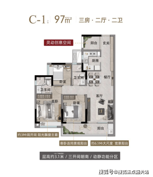 中铁建·花语天宸目前在售楼栋为1-5-6-9栋,均为精装交付,主推建面约97-168㎡精工三至四房,覆盖刚需、刚改、改善全需求,户型设计贴合广州家庭居住习惯,注重实用性、舒适度与采光通风,采用高端住宅基因体系,LDK一体化设计,搭配约3.1米层高、约6.1-9.4米宽景阳台,采光通风极佳,同时采用片区最高装修标准,定制国际品牌六大精装系统,智能化及人性化兼备,超大幕墙比例,堪比汇悦台的前沿“钻铂”外立面,提升户型品质与颜值,具体各户型详细设计如下,均为官方实测尺寸,线㎡三房两厅两卫】